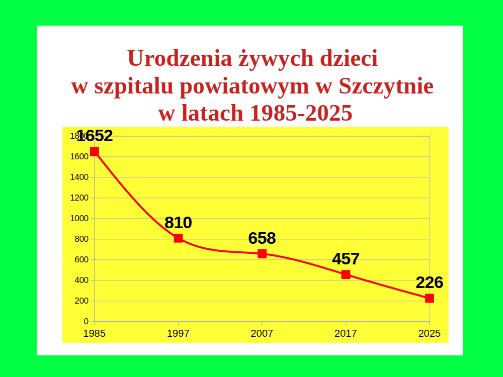 Rok 2025 przyniósł kolejny spadek liczby noworodków w powiatowym szpitalu w Szczytnie. W połowie lat osiemdziesiątych XX wieku rodziło się tam rocznie ponad 1600 dzieci, w 1997 roku liczba ta spadła do 810, a w 2025 roku wyniosła zaledwie 226. W tym samym czasie w powiecie zmarło kilkakrotnie więcej osób, niż się urodziło. Oznacza to, że nasza populacja znacząco maleje. Co więcej, jako mieszkańcy stajemy się coraz starsi – w naszych domach dominują emeryci, a dzieci i młodzieży jest jak na lekarstwo.
