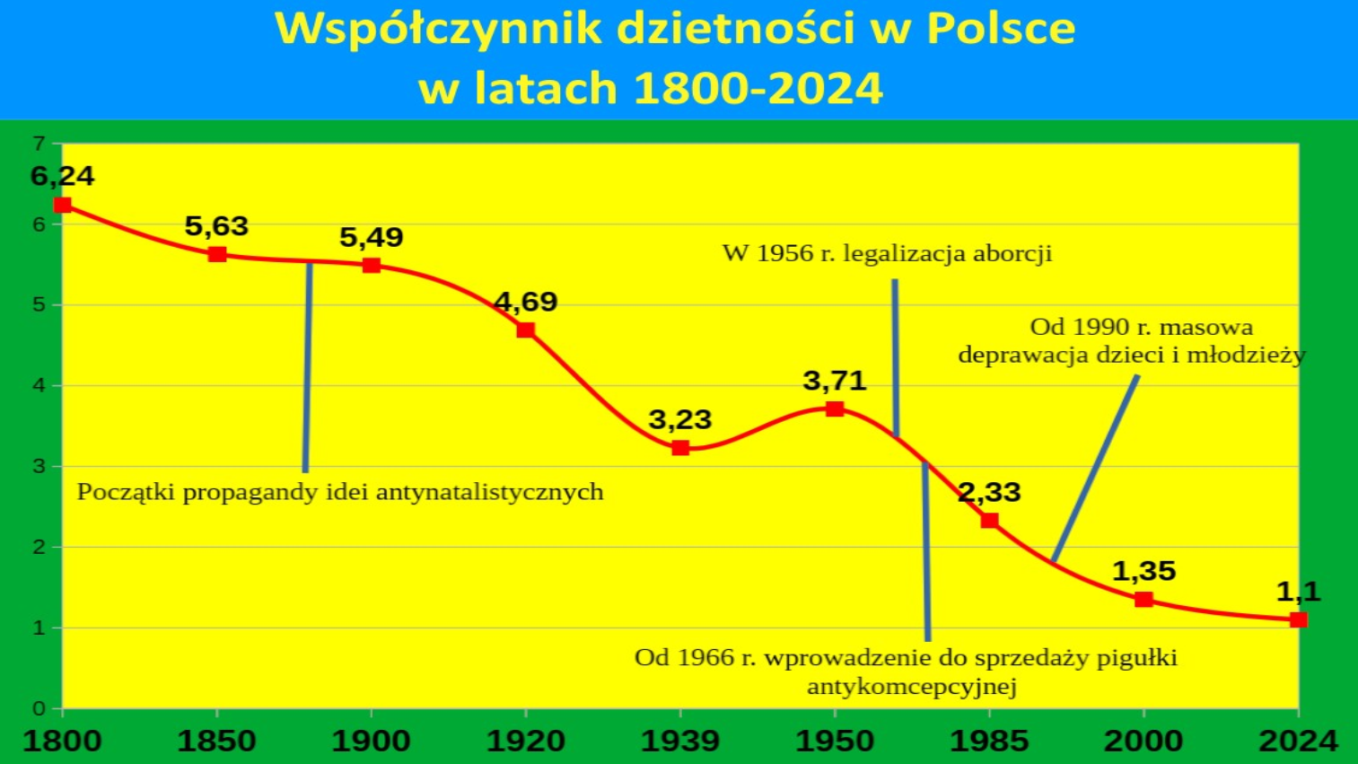 Wiek XIX charakteryzował się stabilnością liczby dzieci w rodzinach. Rodziny były wielodzietne, a życie dzieci było święte. Matkę w stanie błogosławionym otaczano szacunkiem i miłością najbliższych. Wiek XX przyniósł rewolucyjne zmiany w stosunku do życia dzieci poczętych. Z rodzin zaczęto rugować dzieci, zabijając je albo nie dopuszczając do powstania nowego życia. W latach 1900-2020 wskaźnik dzietności w Polsce malał z każdą dekadą. W ciągu stu dwudziestu lat spadł ponad czterokrotnie, z 5,49 w 1900 r., do 1,38 w 2020 r. Macierzyństwo i dar potomstwa w społeczeństwie polskim zostały wyrugowane przez cywilizację śmierci. Od kilku dekad w Polsce mamy płodność grabarską, która prowadzi naród do wymarcia.