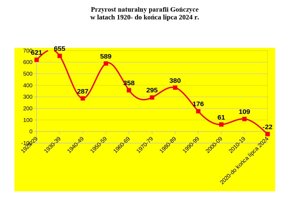 Idee orędzia gietrzwałdzkiego zmieniały oblicze rodzin parafii gończyckiej. W latach 1880-1909 przyrost naturalny prawie się podwoił. Od początku lat dziewięćdziesiątych XIX stulecia każdego roku rodziło się ponad sto dzieci. W roku 1914 w parafii udzielono 149 chrztów, była to rekordowa liczba w latach 1830-2024. I wojna światowa wyhamowała boom demograficzny w parafii. Co przyczyniło się do spadku przyrostu naturalnego w drugiej dekadzie XX w.