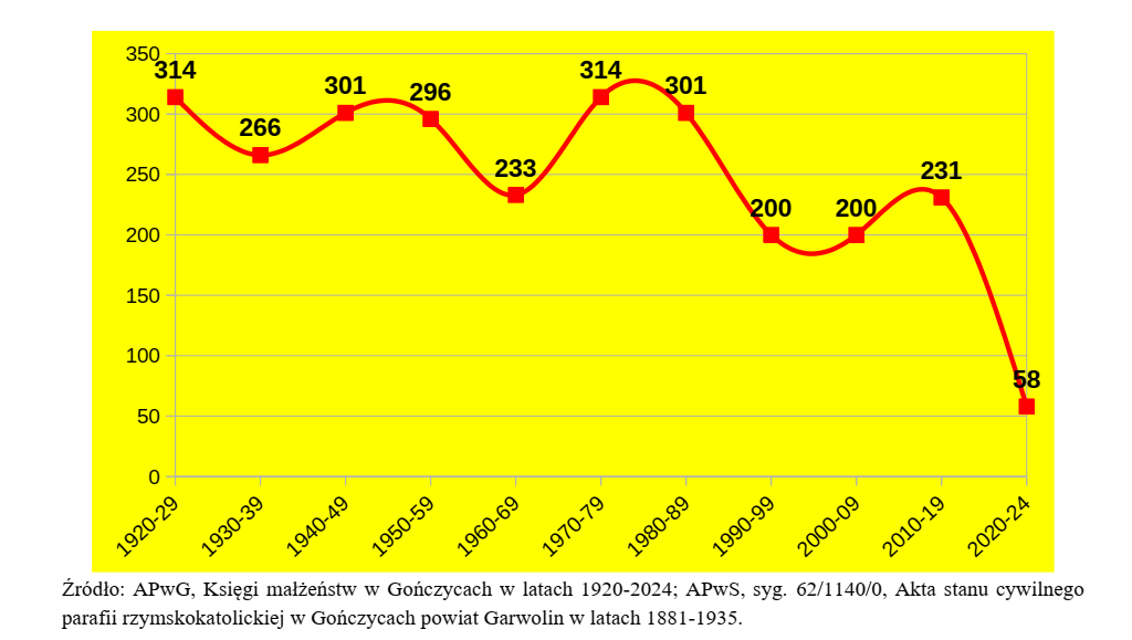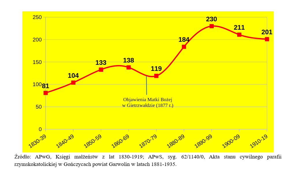 Źródło: APwG, Księgi małżeństw z lat 1830-1919; APwS, syg. 62/1140/0, Akta stanu cywilnego parafii rzymskokatolickiej w Gończycach powiat Garwolin w latach 1881-1935.