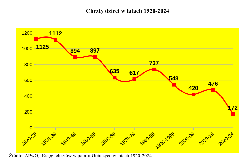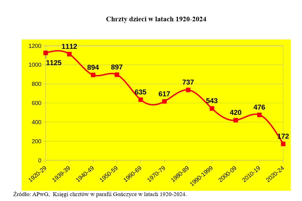 W okresie międzywojennym liczba urodzin dzieci w parafii gończyckiej nadal była imponująca. W ciągu dwóch dekad udzielono 2237 chrztów. Rocznie rodziło się każdego roku ponad sto dzieci. Znaczny spadek urodzin dzieci nastąpił w czasie II wojny światowej. W latach czterdziestych XX w. ochrzczono prawie 900 dzieci. Podobnie było w kolejnej dekadzie. Znaczny spadek chrztów obserwujemy w latach pięćdziesiątych XX stulecia. Przyczyną takiego stanu rzeczy była legalizacja aborcji w 1956 r. a także propaganda środków antykoncepcyjnych przede wszystkim przez prasę dla kobiet. Prym wiódł dwutygodnik „Przyjaciółka”, chętnie czytany przez młode mężatki. W czasach PRL nakład sięgał trzech milionów egzemplarzy. W latach pięćdziesiątych XX w. w stosunku do poprzedniej dekady urodziło się mniej dzieci o 262. Spadek bardzo znaczący.