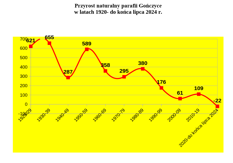 Poniższe kolumny w tabeli zawierają dane liczbowe chrztów, pogrzebów i ślubów w okresie od roku 1830 do końca lipca 2024. Zsumowanie danych w poszczególnych dekadach XIX, XX i XXI stulecia ilustrują nam zmiany zachodzące na przestrzeni kilkudziesięciu lat, a dokładnie od 1830 r. Kolumna dotycząca przyrostu naturalnego parafian Gończyce ukazuje różnice, jakie zachodziły w poszczególnych dekadach pomiędzy osobami ochrzczonymi a tymi, które zmarły. Należy pamiętać, że chrzest obejmował prawie 100% dzieci, które urodziły się w granicach parafii Gończyce.